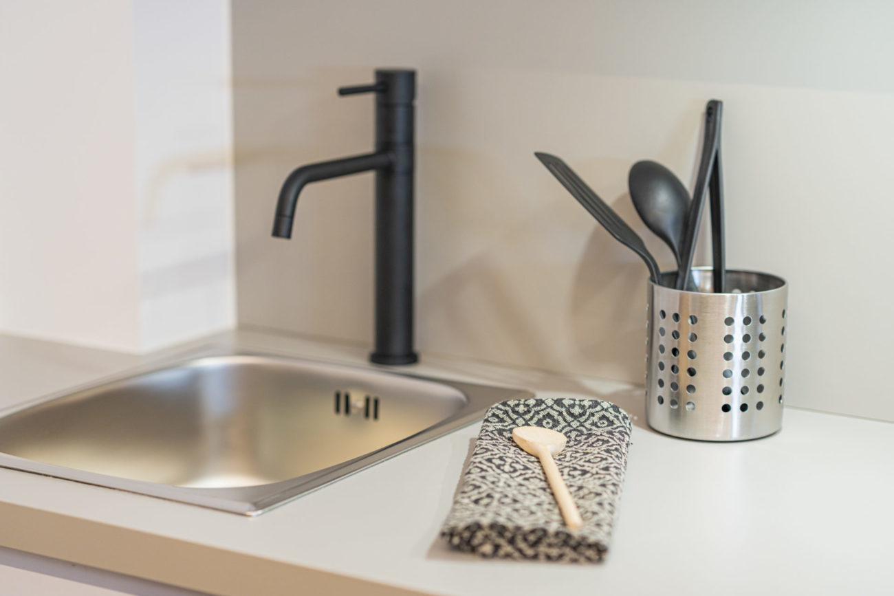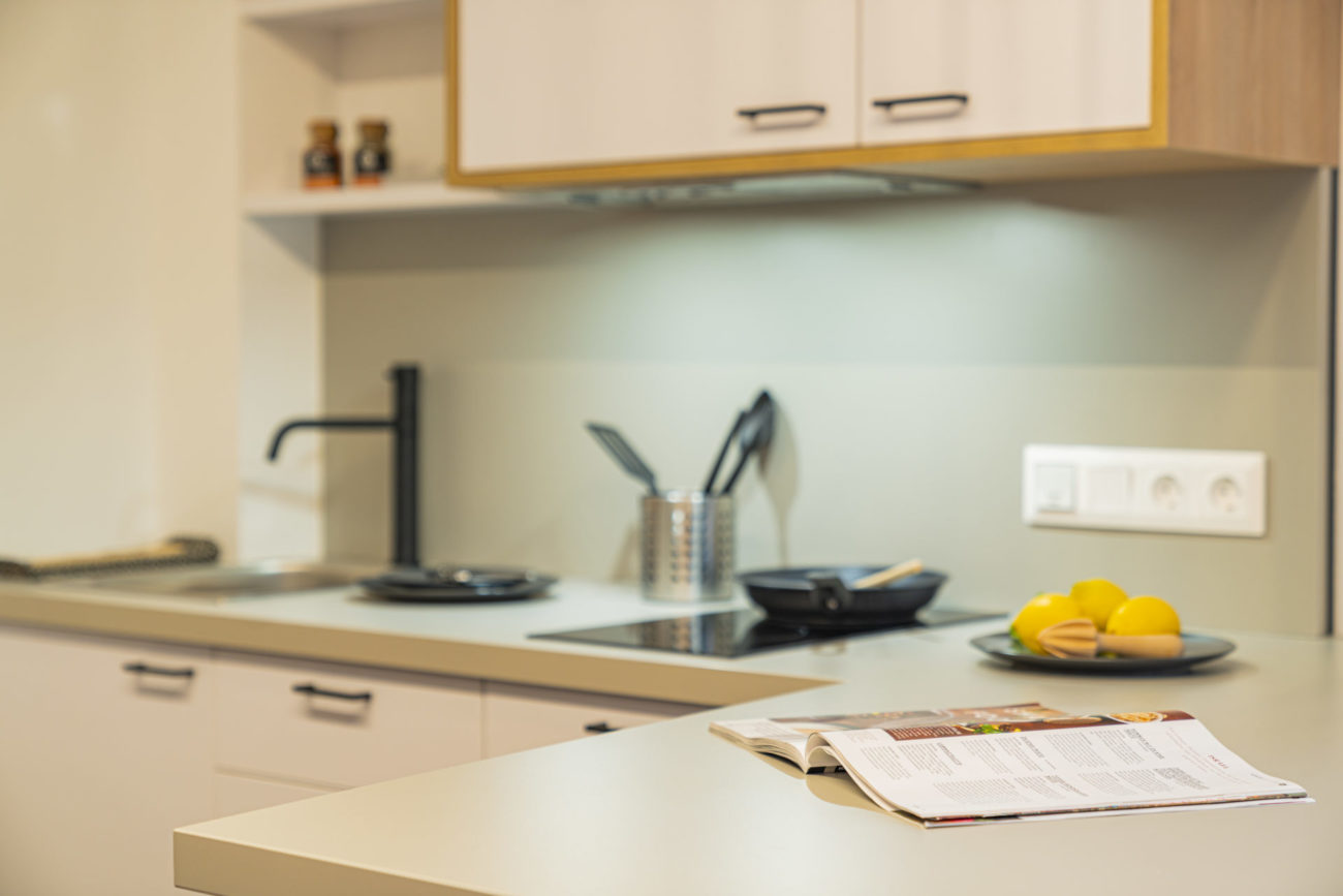 • Einbauküche mit Spüle, 2 Herdplatten, Kühlschrank